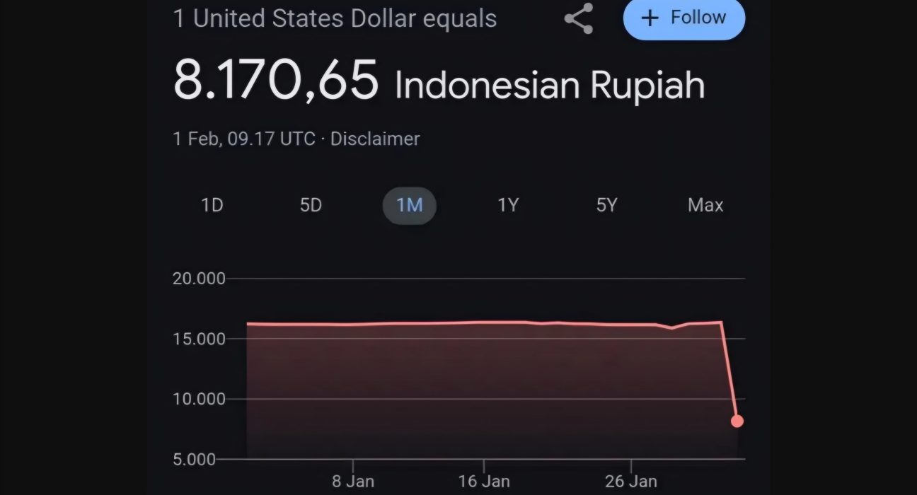 INTENS PLUS – JAKARTA. Nilai tukar dolar AS terhadap rupiah tiba-tiba anjlok menjadi Rp8.170,65 di mesin pencarian Google pada Sabtu (1/2/2025). Penemuan dalam pencarian itu langsung viral dan menjadi perbincangan hangat di media sosial X, dulunya Twitter.