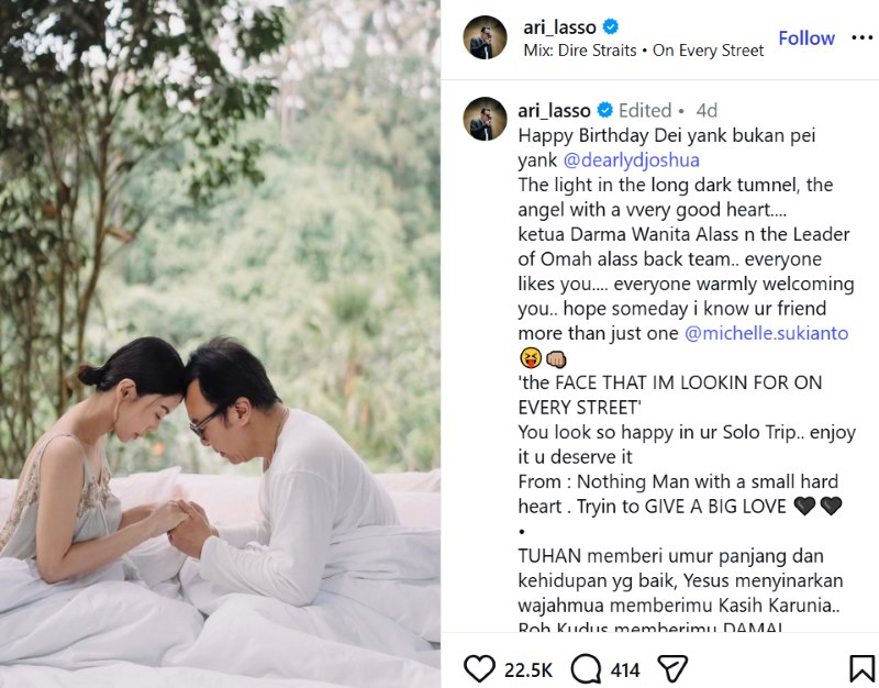 Lewat akun Instagram @ari_lasso, pada 5 Desember 2025, Ari menuliskan pesan panjang untuk Dearly yang tengah merayakan ulang tahunnya. Dalam unggahan yang dipantau Selasa (9/12/2025), mantan vokalis Dewa 19 tersebut menyapa Dearly dengan panggilan mesra dan menuliskan kalimat penuh makna.